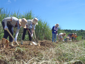 サンゴ礁の海に土が流れ出ないように、畑の周りに育てた月桃。その商品づくりに村をあげて取り組んでいます。