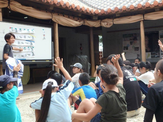 毎年沖縄大学生の学生さんたちと一緒に行ってます。沖縄大学の学生さんたちは、教職課程をとっている学生さんたちなので、このキャンプで自然についてのことや、石垣に関すること、白保に関することなど様々な事柄についての授業を行ってくれます。石垣島には、大学や専門学校が無いので、大学生の話にこどもたちも興味津々。