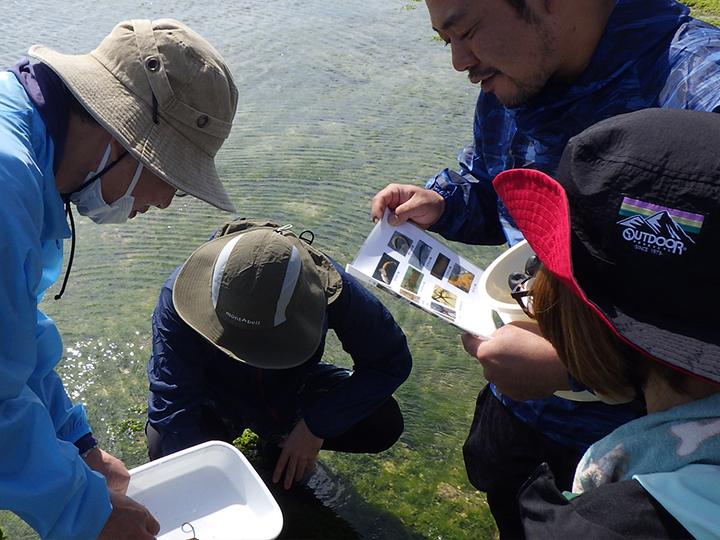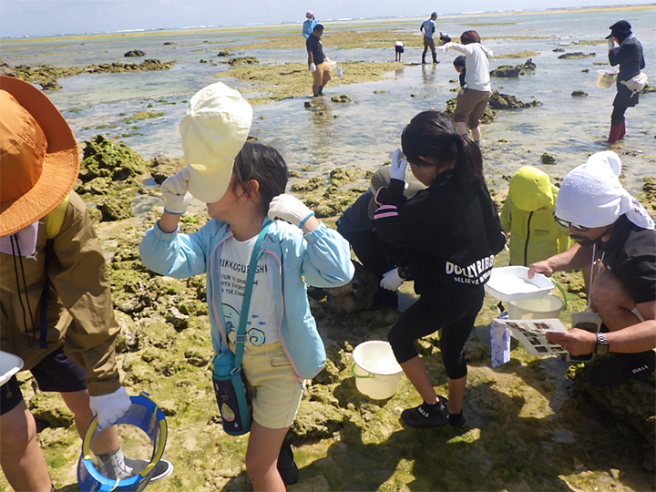 ちびっ子も大人も楽しみながら、環境学習としての調査です。ひのくにベントス研究所の森敬介先生に協力いただき、たくさんの質問が飛び交う調査となりました。身近な海を知ることができ、定期的にモニタリングを続けることで、白保の生物多様性の豊かさの指標となります。