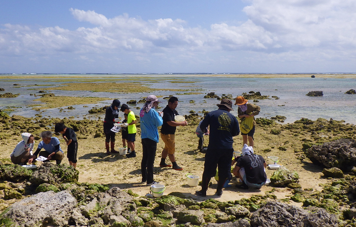 3月5日、白保海岸でベントス(底生生物)調査を行いました。これまでは、主に石垣島の中高生と一緒に行ってきましたが、今回は家族参加型の調査として、7家族17名、しらほ学童クラブや白保日曜市を利用されているご家族に参加いただきました。