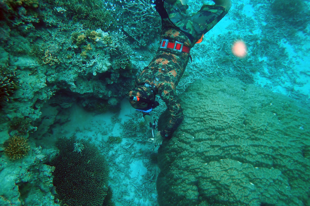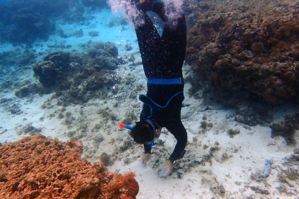 この日は、水温計の交換を行ってもらいました。海水温のデータを収集しています。30°Cを超える水温はサンゴにストレスを与えます。
