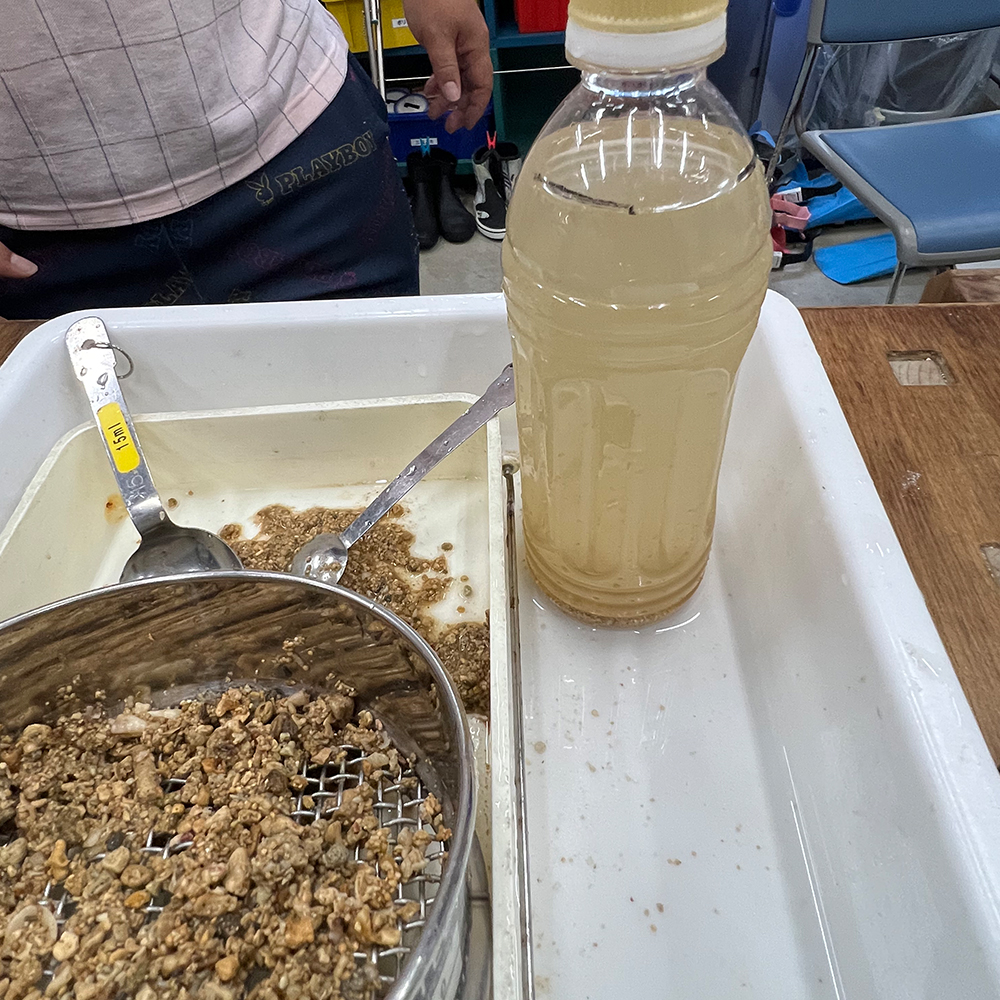 採取した砂を分析します。赤土の量に応じて、ランクを9段階にわけて海底の状況を判断します。ランク5b以上、1立方メートルあたり30キログラムを超えるとサンゴに悪影響がではじめます。